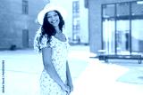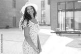 Smiling dark curly haired woman in hat walking confidently down a city street