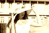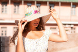 Portrait of young pretty trendy girl in hat posing at the city, summer street fashion.