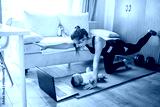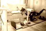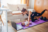Postpartum recovery training at home. Young mom exercising together with baby girl on yoga mat. Doing sports with infant