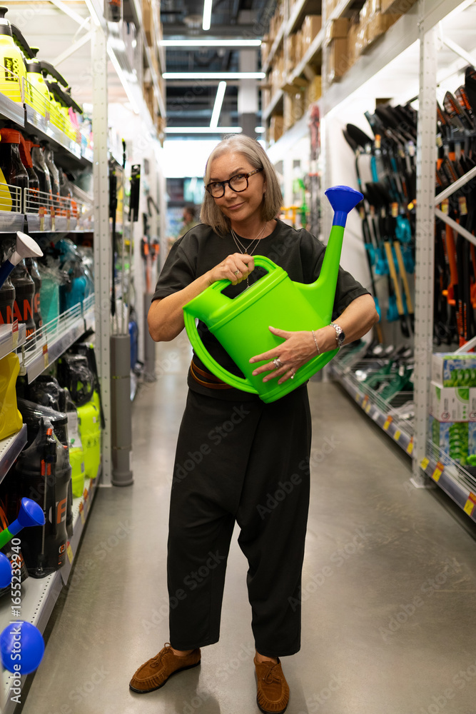 Woman holds large green watering can in home improvement store aisle with gardening tools and supplies