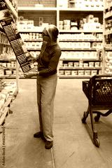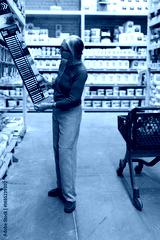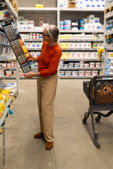 Older woman selects paint color swatches in a home improvement store aisle during the day in a well-organized retail environment