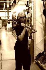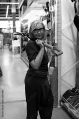 Woman posing with a gardening tool in a home improvement store aisle during daylight