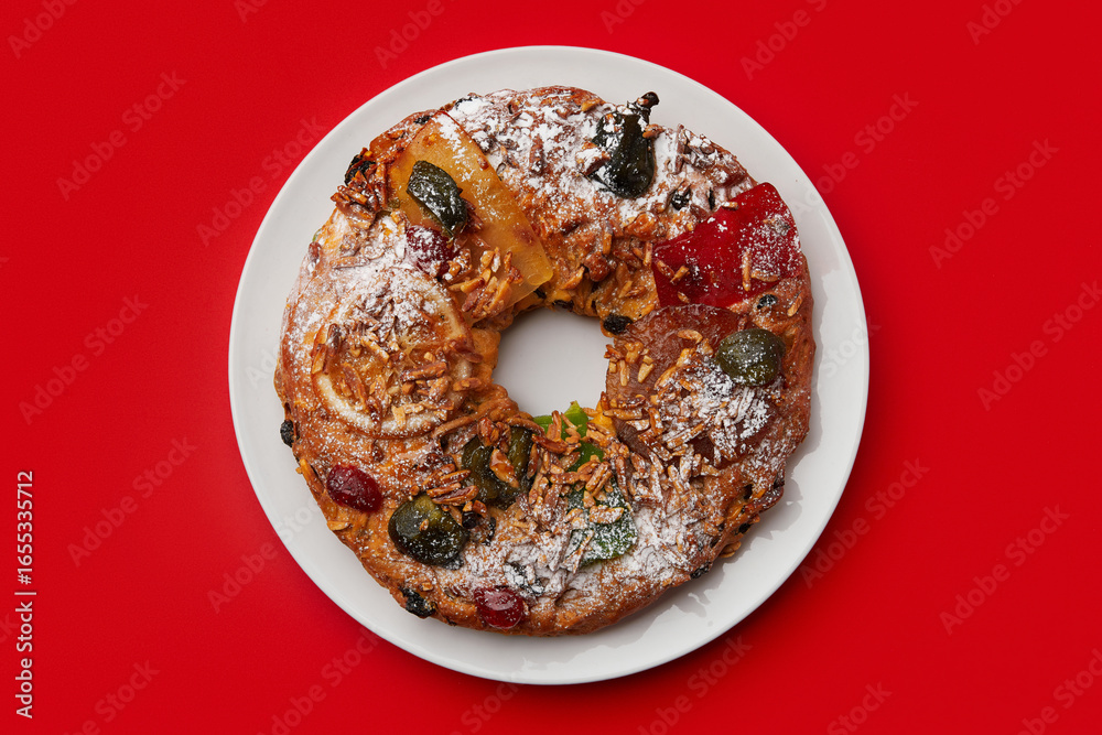 A close up of a festive cake on a white plate, surrounded by a checkered napkin and cutlery