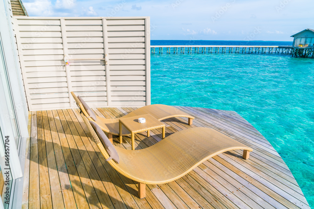 Two deck chairs on the wooden floor in water villa sunset time ,maldives island .