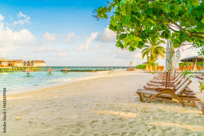 Beach chairs with umbrella at Maldives island, white sandy beach and sea .