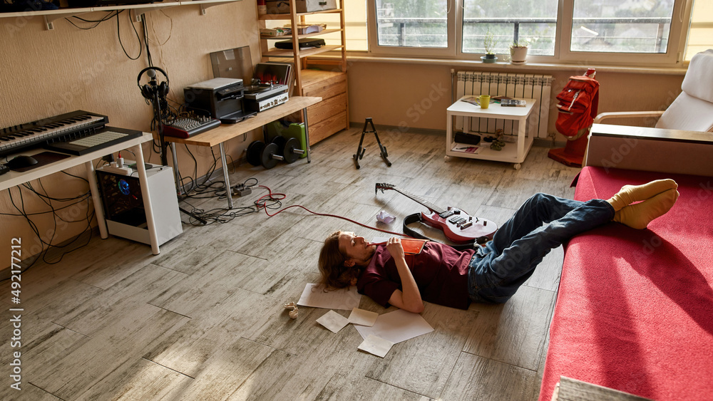 Halloween party composition with empty card from envelope with festive decoration from pumpkins, bats, spider web, ghosts on golden background top view.
