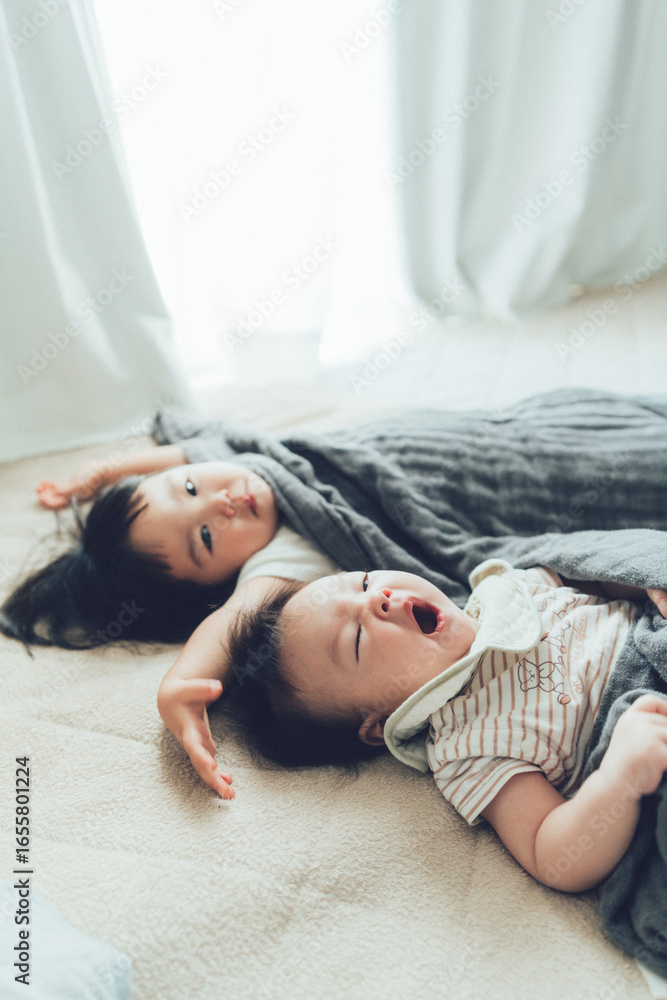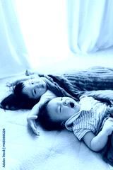 ベッドに寝転がる小さな姉妹