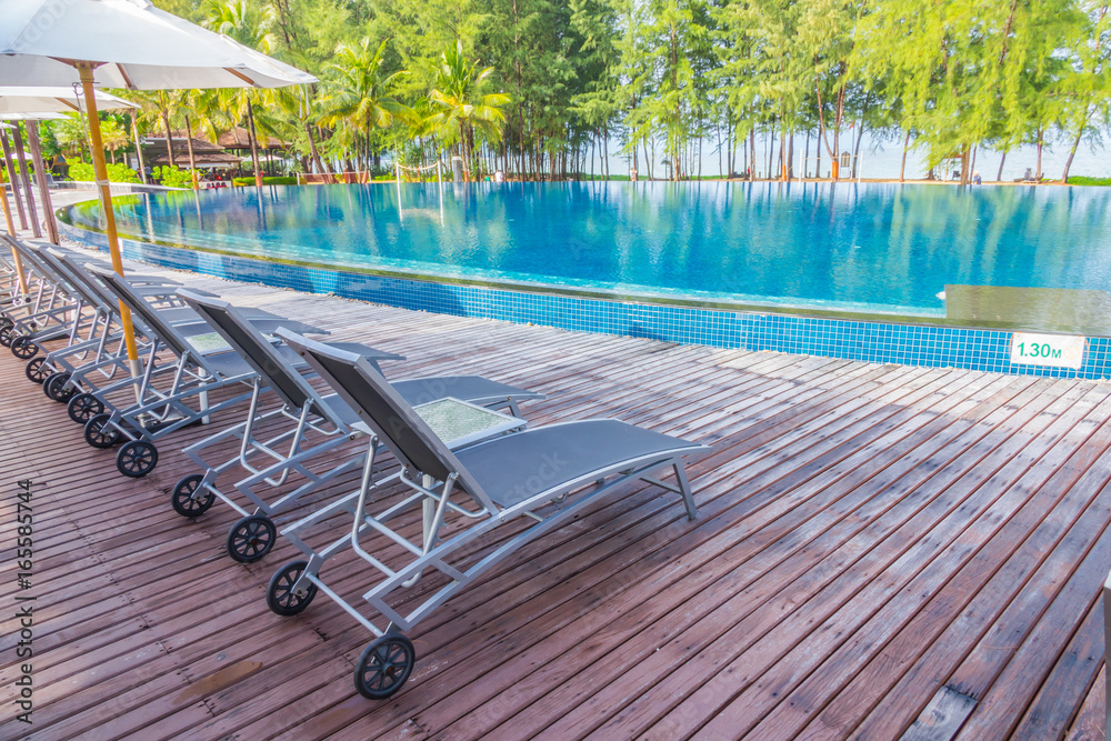 Swimming pool with relaxing seats near the sea .