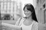 Happy asian tourist exploring a new city using a traditional paper map, enjoying her summer vacation abroad