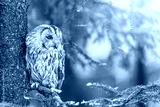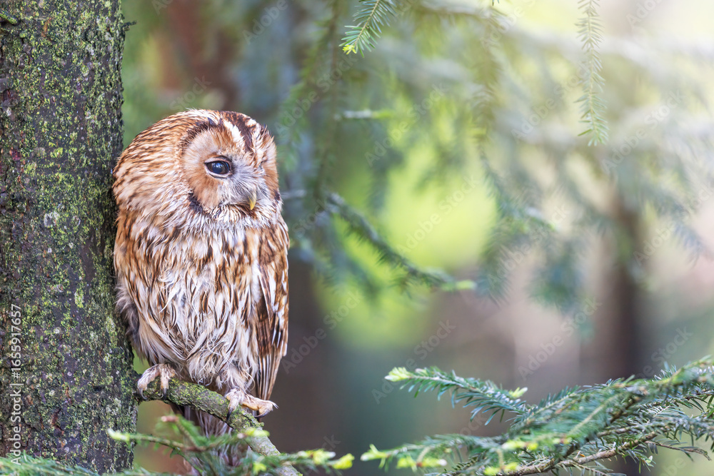 Closeup view of the Tawny owl sitting on a tree branch and looking at the side. Horizontally.