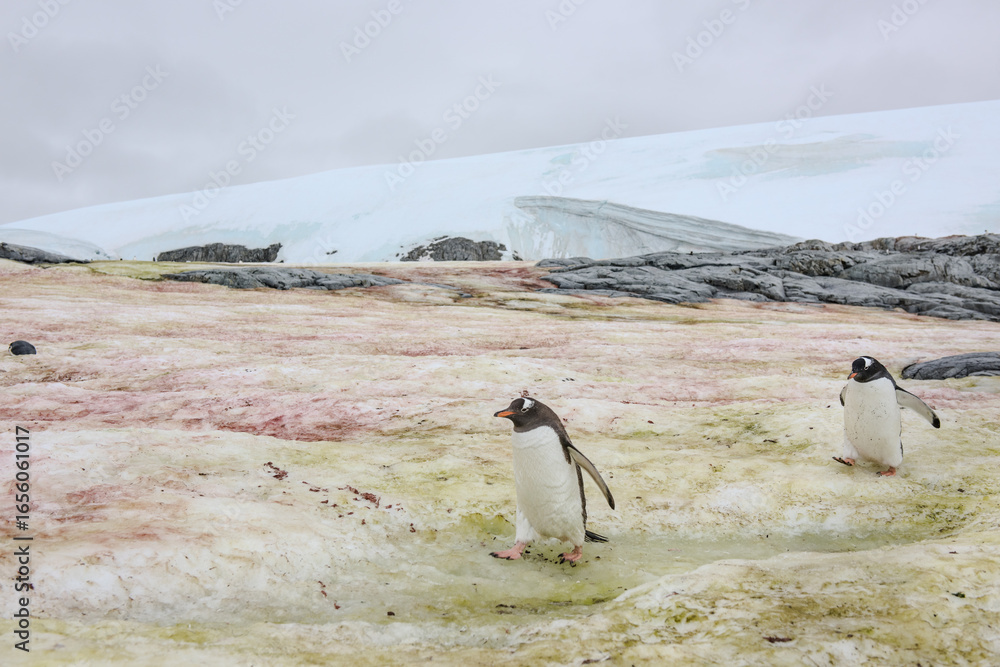 Two Gentoo penguins waddle across the snow and ice in Antarctica.