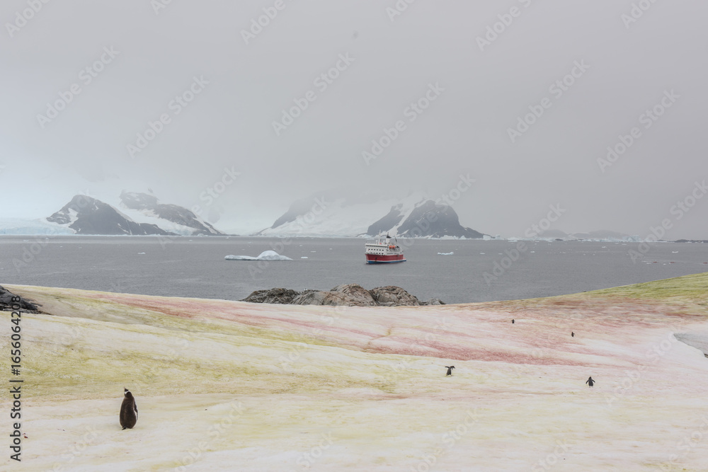 A cruise ship sits in the bay of an Antarctic island as penguins waddle across the snow-covered landscape.