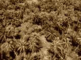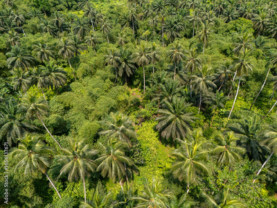 Aerial view of dense tropical palm forest in São Tomé with layered greenery and lush jungle vegetation.