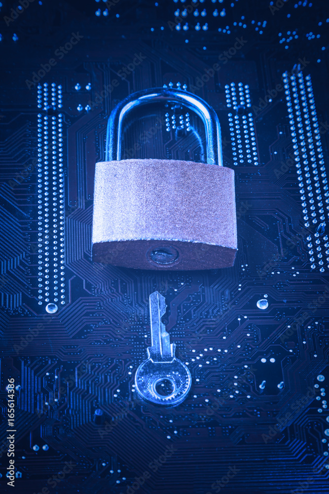 Padlock with a key on computer motherboard. Internet data privacy information security concept. Blue toned image.