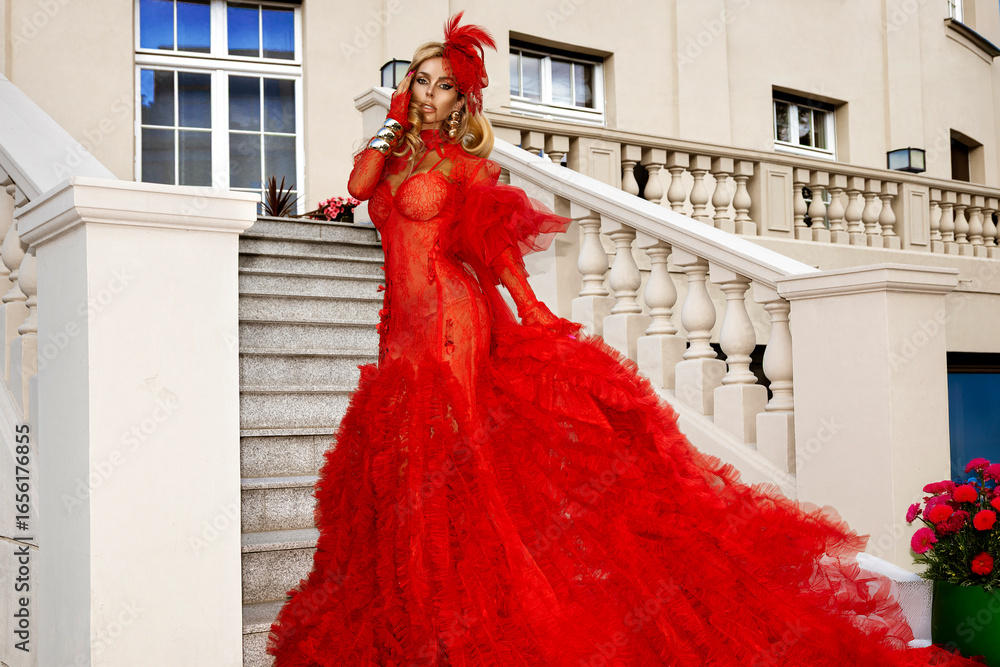 Elegant woman in luxurious red couture gown with feather details posing on stairs outdoors, glamorous fashion photoshoot in evening dress on summer day
