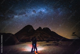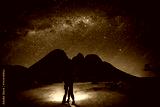 Landscape with Milky Way. Night sky with stars and silhouette of a couple.