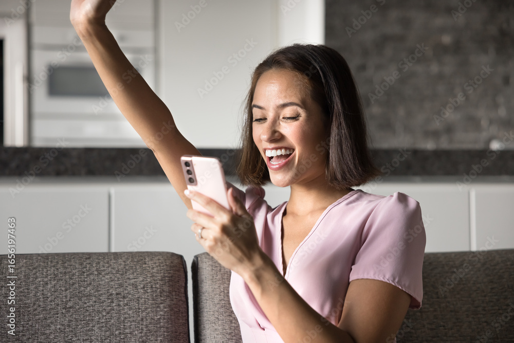 Digital victory. Excited lucky gen z girl celebrate unexpected virtual win scream with joy raise hand up looking at cellphone screen get prize notification crypto gain reward message great news text