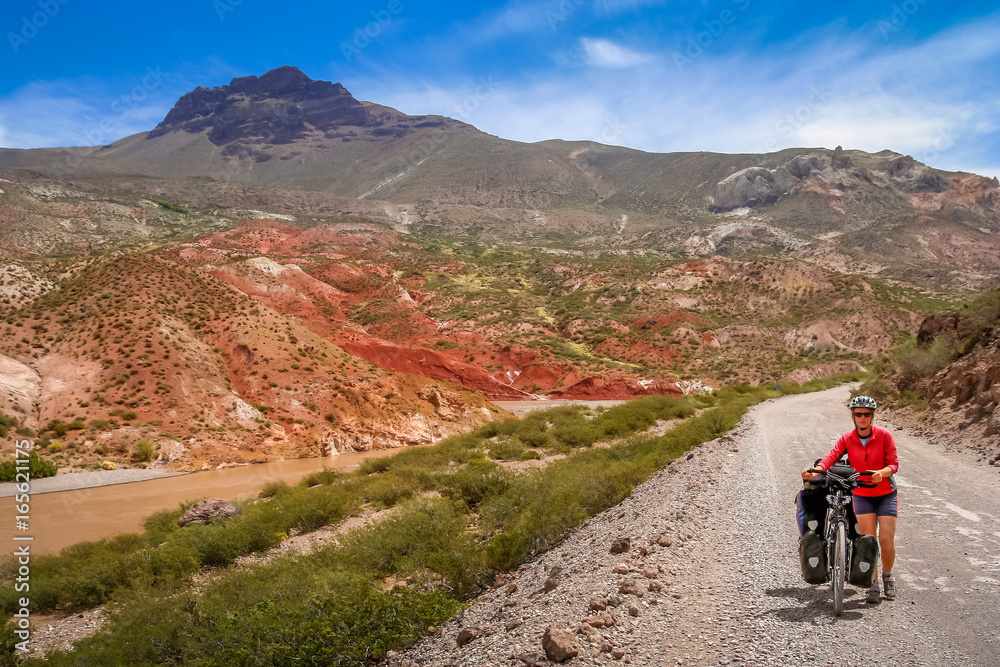 Woman cycling on the Ruta 40 Quarenta in Argentina