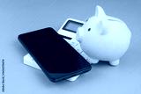 Piggy bank and smartphone on calculator on grey background.