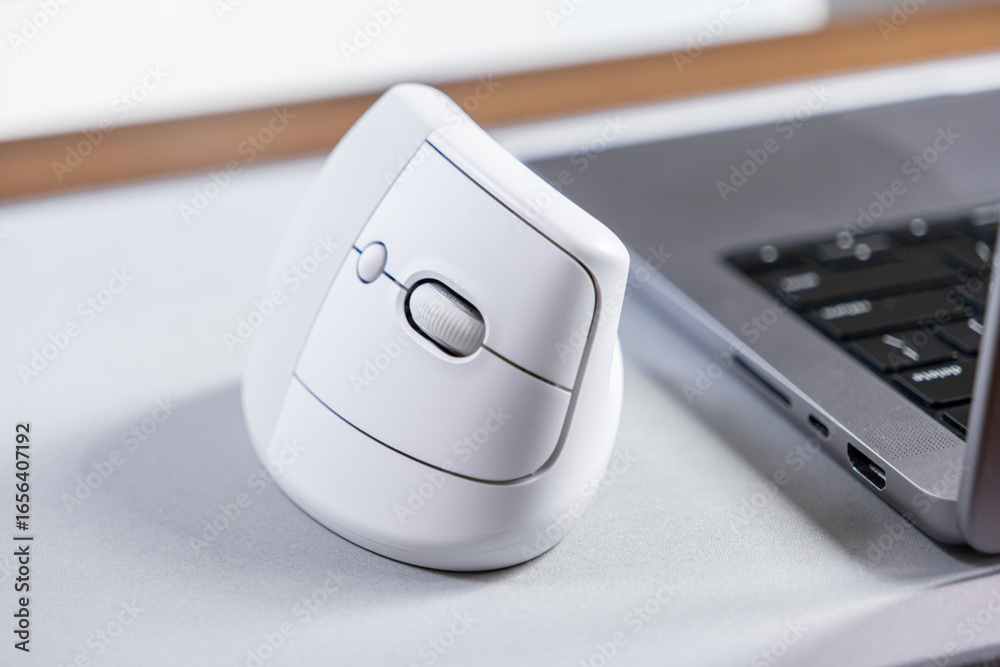 White ergonomic vertical mouse stands beside a laptop, promoting wrist comfort and enhanced productivity for efficient digital work in modern office and home environments