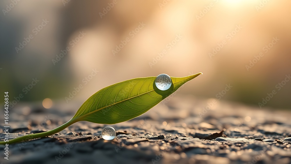 Single tea leaf with dewdrops, morning sunlight highlighting veined texture.