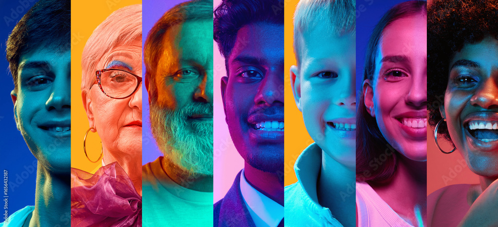 Colorful vertical portrait collage of diverse smiling people. Concept of global inclusivity, modern community, unity, creative campaigns, and positive representation in branding and design.