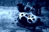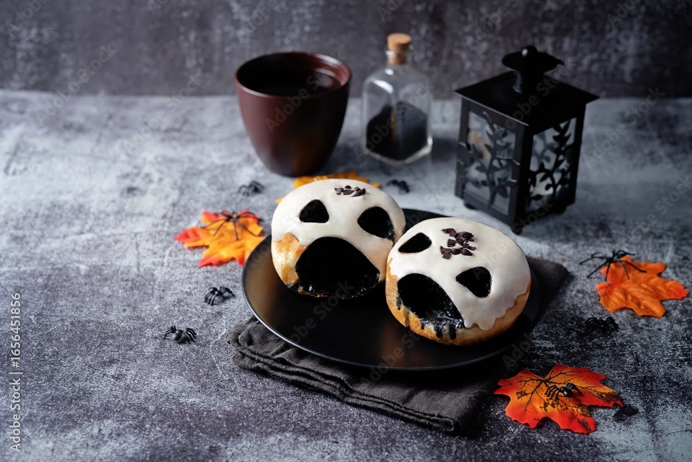 White and black chocolate donuts topping in the form of zombie in a plate for Halloween holidays