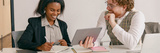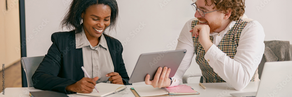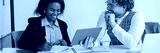 Two experienced professionals are engaging in a productive meeting using a tablet and handwritten notes