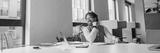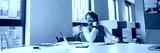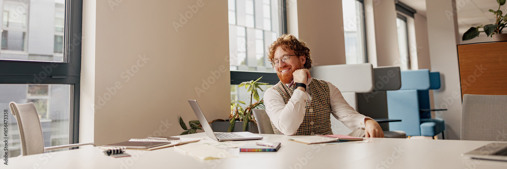 A contemplative man sits in a modern office, deeply reflecting on his work ideas at his spacious desk