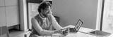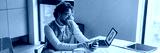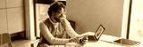 An individual, highly focused, engages with a smartphone while comfortably seated at a stylish office desk setup