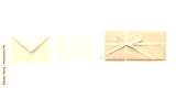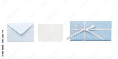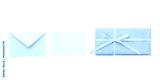 Cutout of a closed blue glitter envelope with a white message card and a blue gift, shown in overhead view