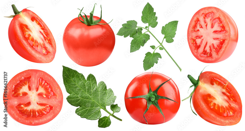 Fresh ripe tomatoes and green leaves isolated on white, set