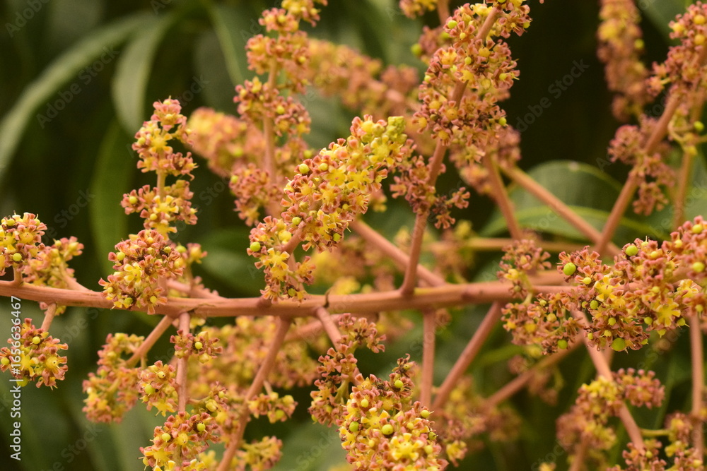 Galho de mangueira florido, florescimento da árvore de mangueira, flores da manga vista de perto