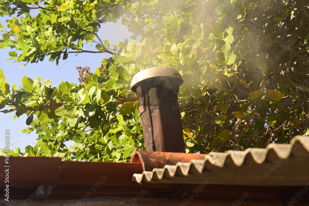 Chaminé de forno a lenha improvisado como telhas vermelhas e panela de metal, saída de fumaça do fogão de barro em casa de farinha no interior nordestino