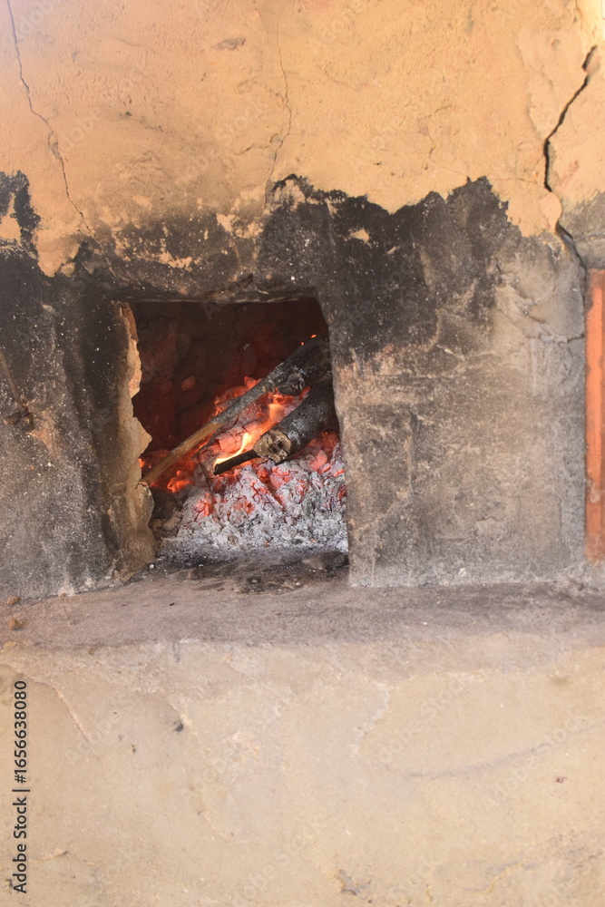 Brasa de fogo no interior de forno a lenha feita de barro e pedra no interior do sertão nordestino