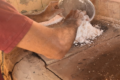 Preparo da tapioca tradicional nordestina em tapiocaria rústica, goma e coco ralado espalhados sobre forno a lenha de barro