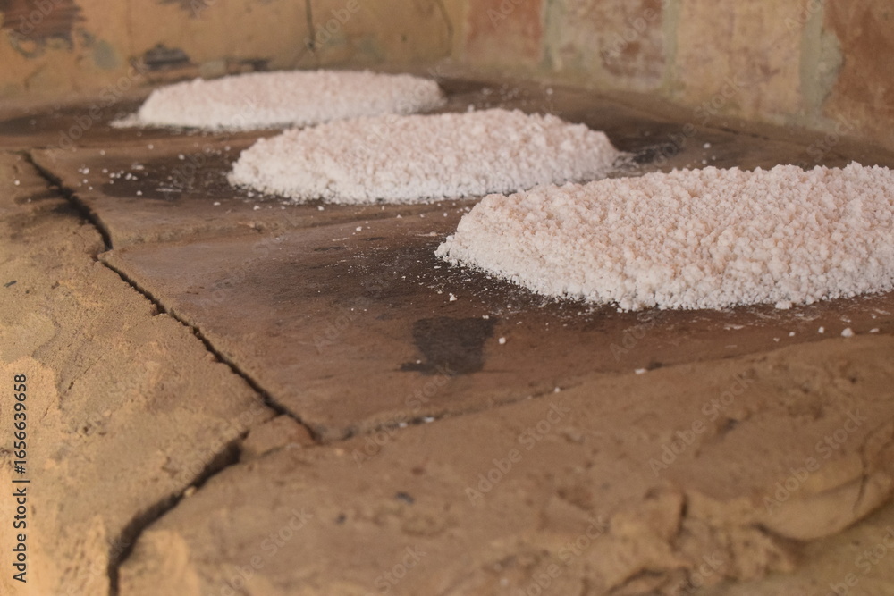 Forno a lenha do sertão nordestino com tapiocas assando sobre pedra, comida típica regional com goma de mandioca e coco ralado