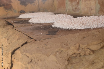 Forno a lenha de barro e pedra no nordestino com tapiocas assando sobre pedra, comida típica regional com goma de mandioca e coco ralado
