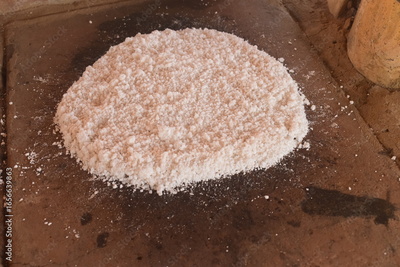 Uma tapioca de mandioca e coco tradicional do sertão nordestino sobre pedra de forno de lenha