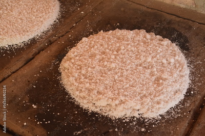 Goma de mandioca com coco ralado sobre forno a lenha de pedra, massa de tapioca regional assando em casa de farinha nordestina