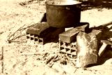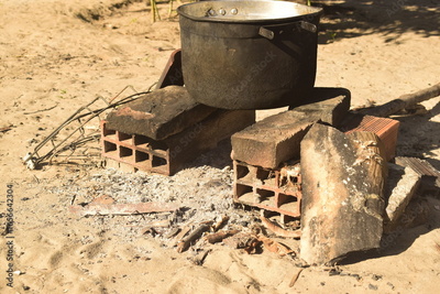 Fogo de lenha com panela preta suja de fuligem feita com tijolos empilhados em meio a areia no interior de fazenda no sertão nordestino