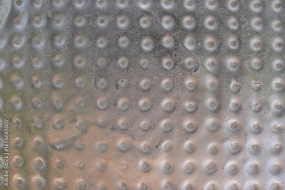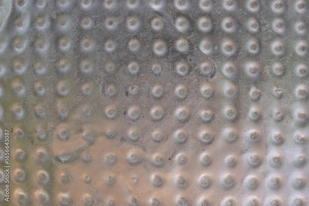 Superfície metálica reflexiva com furos circulares, fundo com chapa de metal com pequenas saliências enfileiradas