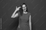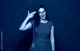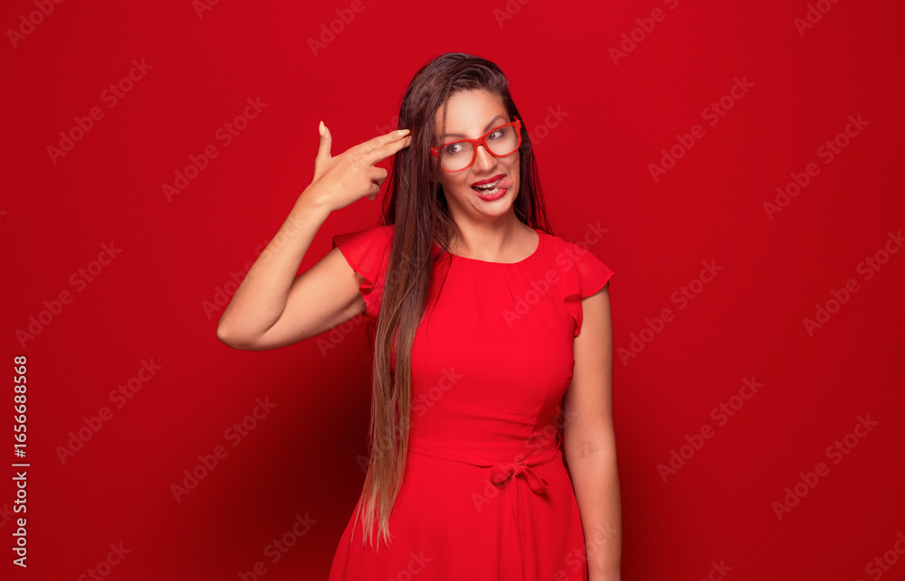 Funny woman makes finger gun gesture in temple, pretends committing suicide, isolated on red background. Silly girl sticking out tongue.