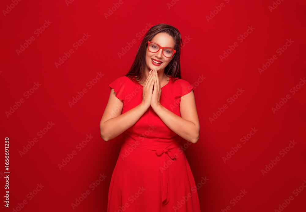Happy young woman while keeps palms closed. Happy woman with smile face expression, isolated on red background.