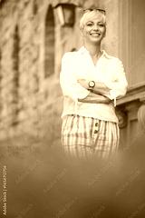 European happy blond adult woman looking to camera. Smiling face of beautiful mid aged female person dressed in white summer shirt. Outdoors