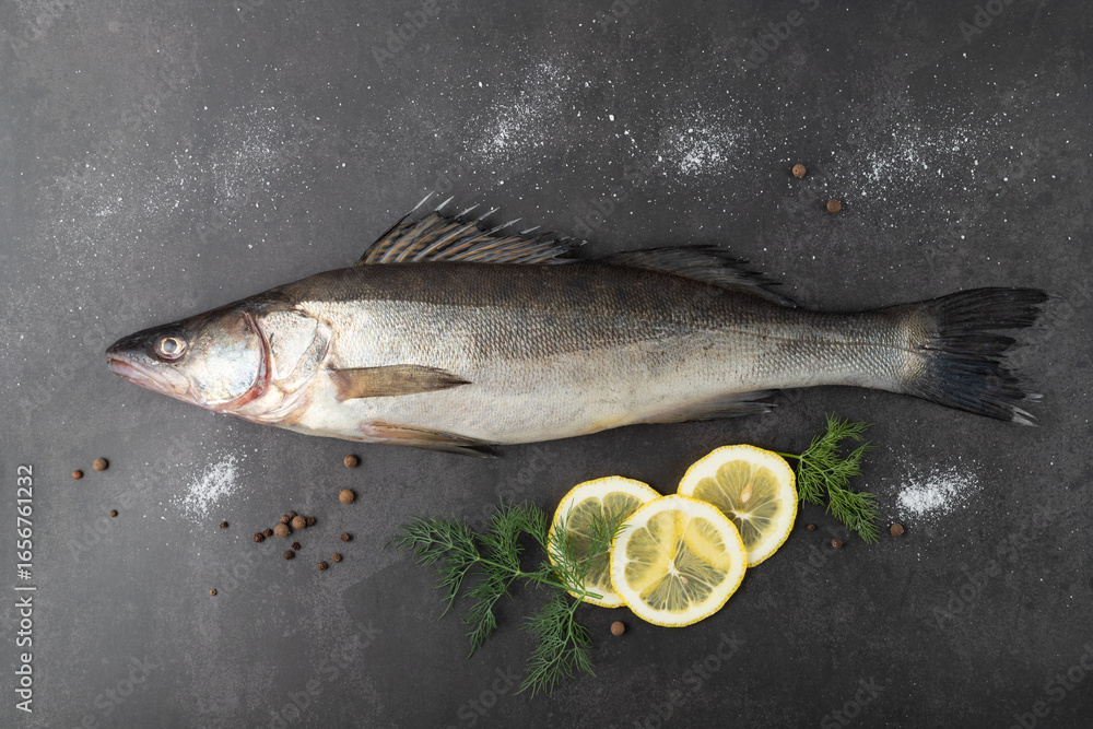Whole unpeeled fresh zander or pike perch fish with lemon slices, dill and spices on grunge stone table background. Raw walleye freshwater fish