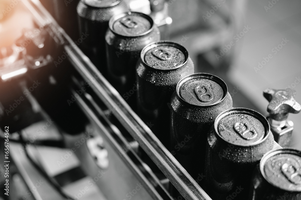 Industrial beer canning line with freshly sealed beverage cans in drink factory