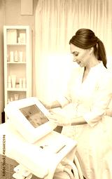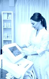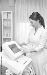 Young caucasian female technician operating skincare equipment in clinic setting.