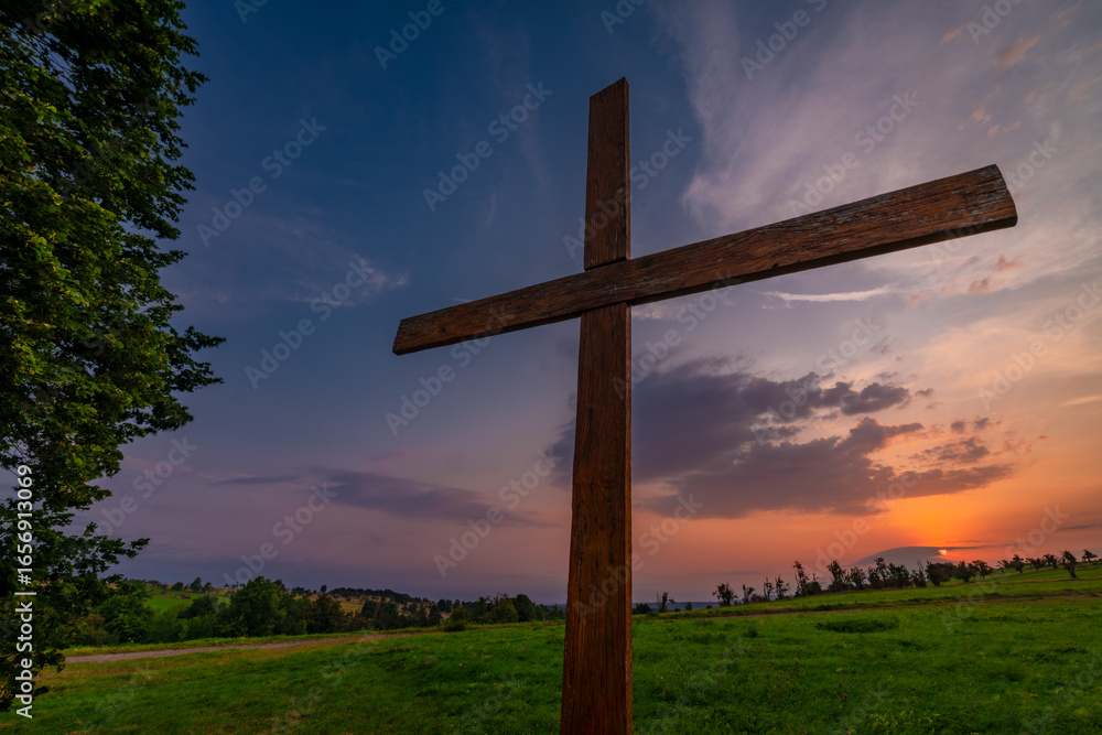 Golden hour cloudy sky top of Krusne mountains morning in Naklerov village