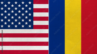 The diagonal and stitched-aligned combined USA and Romania flags. Concept of Strategic negotiation, national relationship, Conflict, and War.